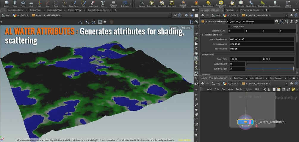 AL_water_attributes : Generate water attributes (Wetness, Beach, Waterlevel) usefull for procedural shading and scattering.